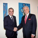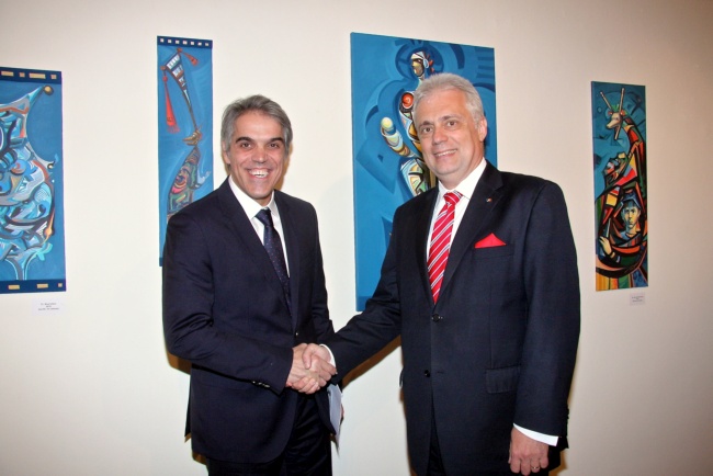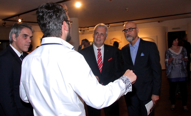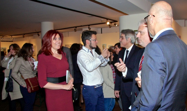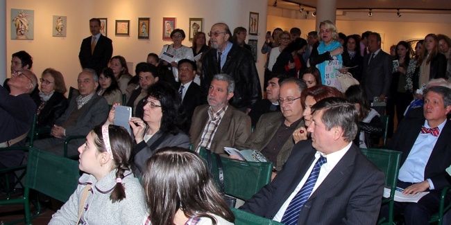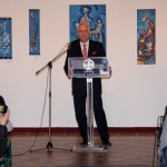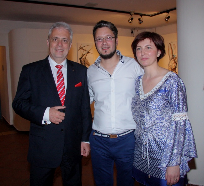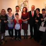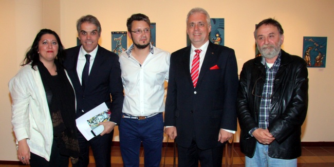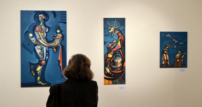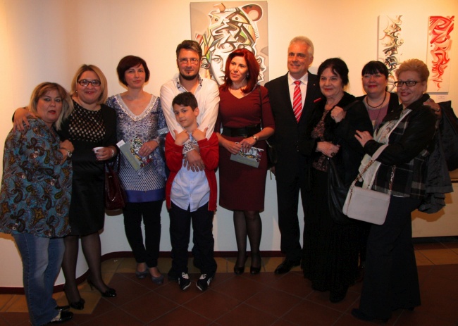 The focal points in his art are human beings (with central persons those of his wife , his son and his own) as well as their connection to nature and modern civilization. The mother with her child in her arms, the primitive dances and the buck as symbols of fertility are interlinked with forms that remind us of frozen buildings and cold machines. Forms which relegate to sculpture , bright colors which clash with one another (dominant is the presence of green and red that are used a lot in Romania ), patterns which refer to the linear design of Byzantine religious painting as well as the Japanese or Arabic type of writing , stylized figures in motion are what someone can seen when looking at the artist’s work . In some cases his human beings suffer from the civilization that they have created while in some others they dance liberated from it , wearing colorful tassels , fringes and earrings met at various customs.